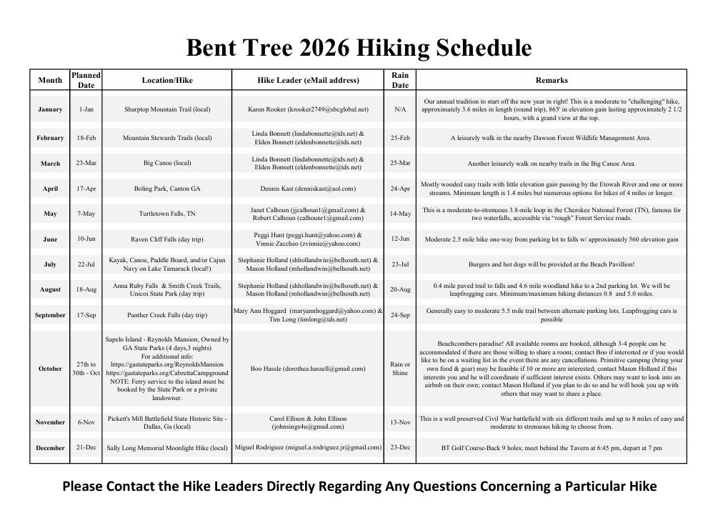 If you would like to be added to the hiking club’s roster and receive notices of upcoming hikes, as well as any changes to the schedule, postponements, rain delays etc. email